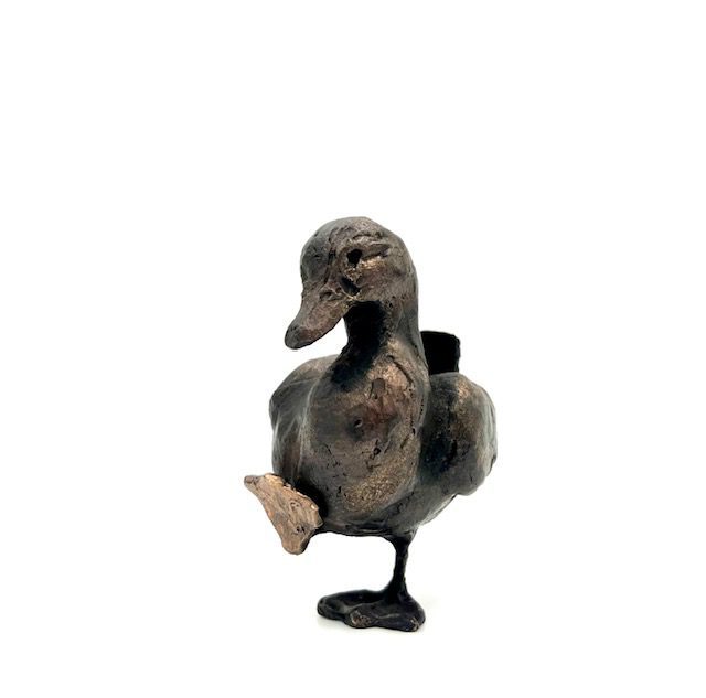 Dit kleine eendje met goudkleurig pootje is er in groene en bruine patina. Vanaf December zal een grote ook beschikbaar zijn.